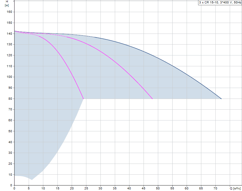 Насосная установка Grundfos Hydro MPC-F 3 CR 15-10ДокументацияГрафик характеристик Hydro MPC-F 3 CR 15-10![]() Установка Grundfos Hydro MPC-F 3 CR 15-10 с вертикальными насосами CR обычно применяют в системах затрагивающих водоснабжение или ирригацию небольших домов и зданий. Особенность исполнения установок с литерой F - один насос управляется от внешнего преобразователя частоты, а остальные включаются в работу напрямую от сети. Шкаф автоматики обеспечивает поддержание заданного уровня давления в трубопроводной системе путем снижения или повышения частоты вращения насосного агрегата, электродвигатель которого подключён к преобразователю частоты, а также и включением в работу или отключением необходимых насосов. Очерёдность включения каждого из трех насосных агрегатов с мощностью двигателей 11 кВт происходит автоматически, в зависимости от нагрузки и времени наработки каждого. Расшифровка типовых обозначений для насосного оборудования Grundfos MPC-F N CR X-Y, где F - только один из насосов работает от ПЧ, все остальные включаются в работу напрямую от сети, N - суммарное количество насосов, CR X-Y - марка насосного агрегата. Размещение установки Hydro MPC-F 3 CR 15-10 в помещении и введение её в эксплуатацию должно производиться с соблюдением принятых норм и правил.
